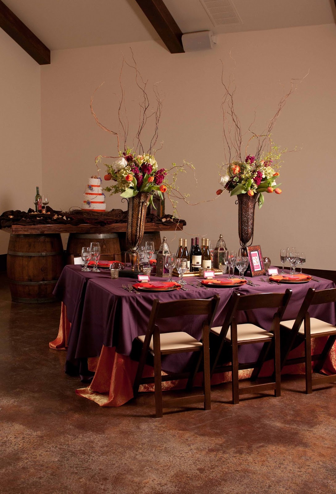 The Winery Romance Theme was inspired by the couple that loves to visit local Hill Country Wineries in Texas, host wine tastings in their home with friends and family and are planning a honeymoon in Napa Valley. Their first date was at a Wine Dive in Austin where they found how how much each other enjoys discovering new wines. Little details like personalized wine corks; wine grape accents on the place cards and menu cards, and the cake; are the little details that make their wedding unique. In addition, their guests would have an array of fruits, meats and cheeses for appetizers, dine on a hand selected steak and wine paring over candlelit dinner reception, and take home mini-wine thank-you gifts.