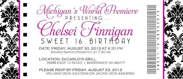 Vanessa contacted me for her client, to place an order for an Old Hollywood Glam inspired ticket invite for an upcoming Sweet 16 party. They wanted black, white, gray, and fushcia used and loved the look of damask pattern. Here's their final chosen design, thanks again Vanessa!