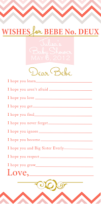 Julisa contacted me to place a huge order for her upcoming baby sprinkle. The theme of the sprinkle is "Belle Bebe No. Deux" as it's her second little baby girl. She wanted stationery to coordinate for a Vintage French feel, but not Parisian, in a super unique color palette of pink, light taupe, gold, and coral. I played around with some ideas, and she ended up falling in love with a simple chevron pattern, complimented by banners and different fonts on the invitation. I carried this feel and design through the rest of her stationery goods: wishes for baby cards, dessert tent labels, thank you stickers, "make your own mimosa" sign, mimosa station labels, welcome sign, water bottle labels, clip-making station sign, food buffet tent labels, and placecard template. Here are all her creations! Thanks again Julisa!